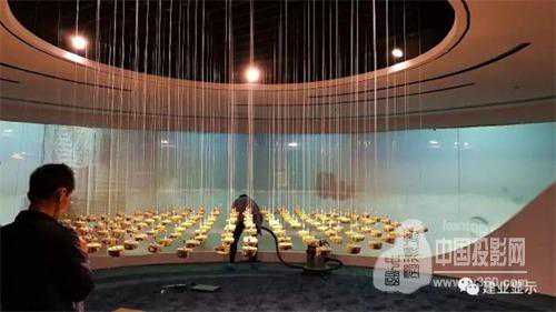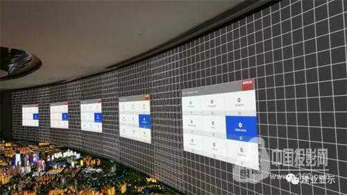 本项目除了数字沙盘展项,另外一个数字展项配置了4台VIVITEK7500流明投影机,搭配0.38:1超短焦反射式镜头,投影一幅弧形通电玻璃幕,在投影的时候我们能看到的是南昌红谷滩的数字内容规划方案,在不投影的时候,通电玻璃呈现透明状,可以看到玻璃后面的纱帘,打开纱帘可以俯瞰“双子塔”附近的风景。