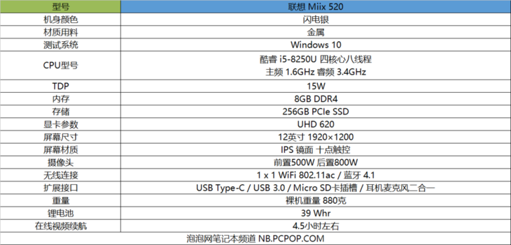 联想Miix520二合一笔记本主机部分重约880g,薄至9.9mm的厚度再次诠释了高性能与极致轻薄完美结合的方案。加上键盘的联想Miix520,重量为1260g,厚度增加甚微,便携程度令人满意。