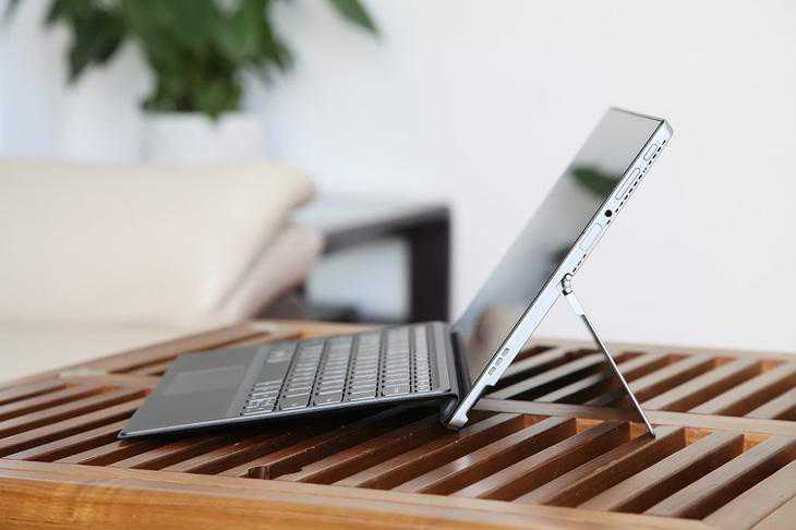 联想Miix520二合一笔记本的表链式转轴支架最高可以打开至160°,不启用支架就是平板模式,支起来是高自由度的工作室模式,加上磁吸式键盘就成了笔记本模式。