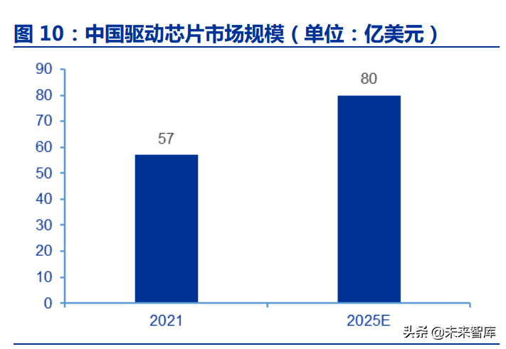 随着面板制造产能持续向国内转移,大陆已经奠定了全球面板制造中心的地位,相应的大陆市场也成为全球驱动芯片主要市场。CINNO预计2021年国内显示驱动芯片市场规模将同比大幅增长68%至57亿美金,至2025年将持续增长至80亿美金,年均复合增长率CAGR将达9%。