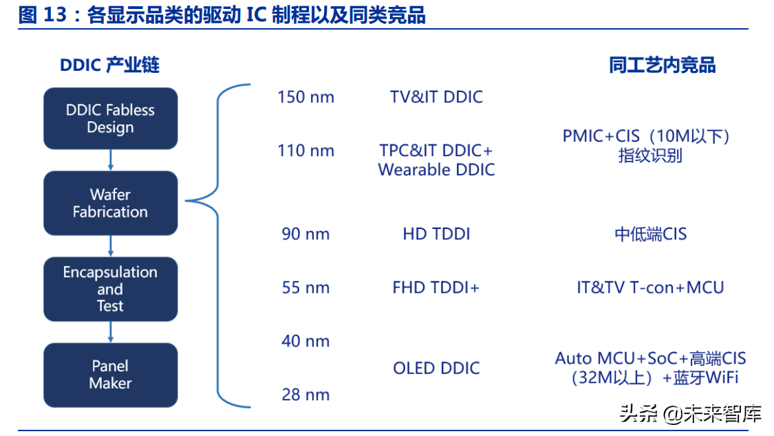 由于显示产品的多样性,显示类驱动IC的制程范围也比较广,其主要产品涵盖了28nm-150nm的工艺段。其中NB和MNT等IT产品和TV主要为110-150nm;主要用于LCD手机和平板的集成类TDDI(Touch+DDIC)制程段在55-90nm;用于AMOLED驱动IC的制程段相对先进为28-40nm;其他规格较低的驱动芯片(穿戴、白电、小家电等分辨率较低应用)我们本章暂不做讨论。