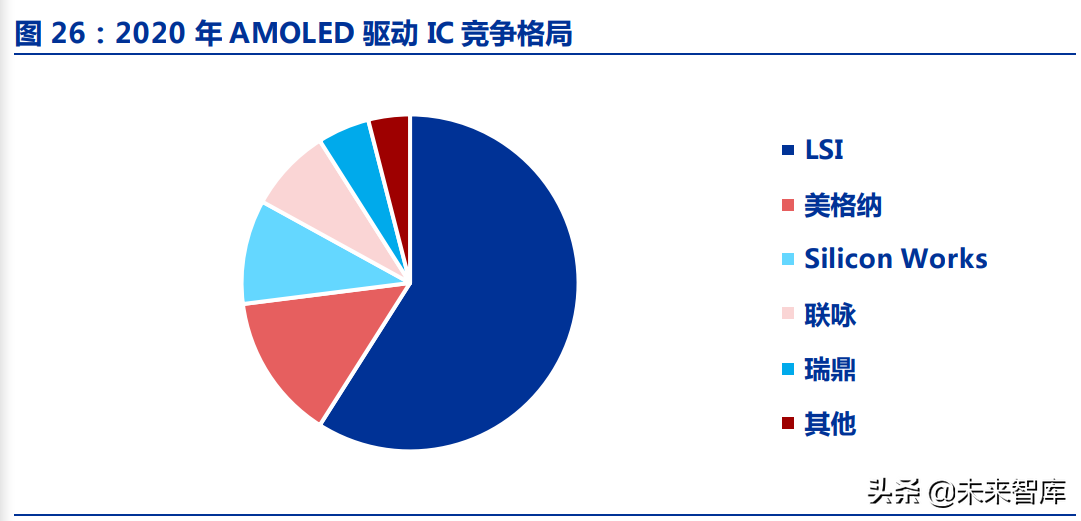 大陆厂商还未具备大规模供货AMOLED驱动IC能力。和AMOLED面板厂商格局相似,AMOLED的驱动IC前三位均为韩厂,包括三星电子旗下的LSI以及LG集团旗下的SiliconWorks,前三者的份额已经超过80%,第二梯队主要是台系厂商联咏、瑞鼎等,大陆芯片厂商未具备大规模供货的能力,目前在缺芯缺产能的情况下,大陆面板厂处于相对被动地位。