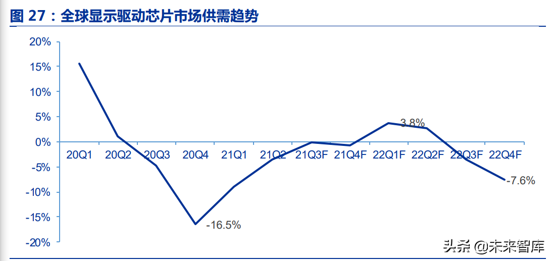 3.供需逐步缓解,结构性供不应求仍持续2020年四季度以来,由于代工厂晶圆成熟制程日趋紧缺,叠加产能分配优先级问题,驱动IC的供应掣肘逐步显现。根据群智咨询测算,DDIC供需比从2020年一季度的15.6%,跌至2020年四季度的-16.5%后,呈现逐渐收窄趋势,供需关系逐渐缓解,预计2022年上半年供需会逐步进入相对平衡状态,但随着供应链产能依旧较紧2022年下半年仍然有缺货风险。