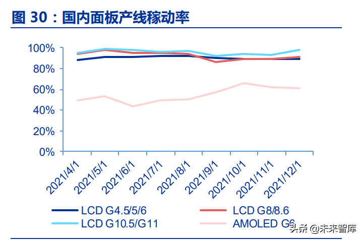 显示驱动IC需求取决于面板整体产能。面板厂的产能上限直接决定了驱动IC的需求上限,即使终端需求相对较弱,但面板厂依然有相当大的动力在不击穿现金成本的情况下维持满稼动,一方面可获得正向现金流,一方面即使亏损也可推动产业重组。从2021下半年面板行业稼动率来看,即使LCD面板价格从高点回调较大,但制造商依然维持约90%的高稼动率。