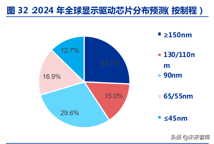 中大尺寸面板显示驱动以成熟制程为主。从制程来看,由于大、中尺寸面板终端产品显示技术已较为成熟,对于集成度要求较手机屏幕要求更低,多用90nm及以上的成熟制程DDIC即可生产。且由于大、中尺寸面板所需芯片数量较多,因此其所使用的90nm及以上制程的DDIC仍占全球DDIC市场的主要部分,2020年市占率达到约80%;在芯片整体向更先进制程节点推进的趋势下,90nm及以上制程的DDIC市占率将逐渐下降,但仍将占据大部分市场份额,根据FrostSullivan预测,在2024年90nm及以上制程的DDIC市占率仍将超70%。
