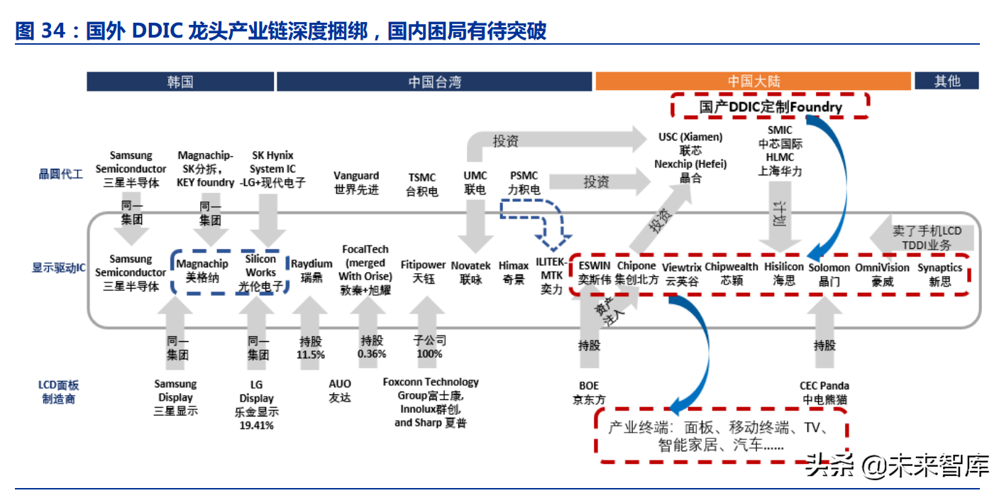 韩厂和台厂的崛起过程中均与上下游形成了绑定关系。DDIC所在的制程分类为高压模拟,虽然已有40nm选项,但2020年前长期低迷的ASP市场,使得中大尺寸TFTLCD用的DDIC无法承担12寸晶圆的高成本线。其应对方式是转往二、三甚至四线代工厂生产,以联合下游面板厂承包产能的商业模式维持对重要客户的供应。因显示驱动芯片行业的商业模式与普通的芯片行业较为不同,以及其出货量大对于代工产能的需求,掌握供应链或为突破方向。目前,驱动芯片厂商主要拥有两种模式,一种模式是韩国的全产业链整合模式,一个集团整合了芯片设计、芯片制造、封装制造、面板厂商和整机厂商;另一种模式是中国台湾地区的上下游绑定模式,驱动芯片设计厂商可以与晶圆代工厂绑定,形成IDM模式,保障工艺开发及产能。