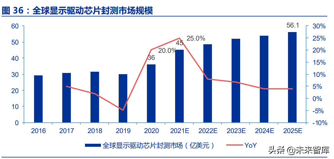 产能紧张带动显示封测市场规模上涨。2015年起,由于京东方等国内领先面板厂商突破,面板实现大宗商品化,整体面板及其零部件处于一个价格下行时期,因此该阶段显示驱动芯片封测市场规模没有显著增长。2020年,尽管疫情带来短期冲击,但居家隔离、远程办公等宅经济效应刺激了显示行业相关终端需求的爆发。同时,由于晶圆代工厂产能紧张,整体显示芯片价格不断上涨带动了显示封测市场的增长,根据FrostSullivan数据,全球显示驱动芯片封测市场规模于2020年达到36亿美元,较2019年增长20%,预计2021年持续增长至45亿美元,同比增长25%。
