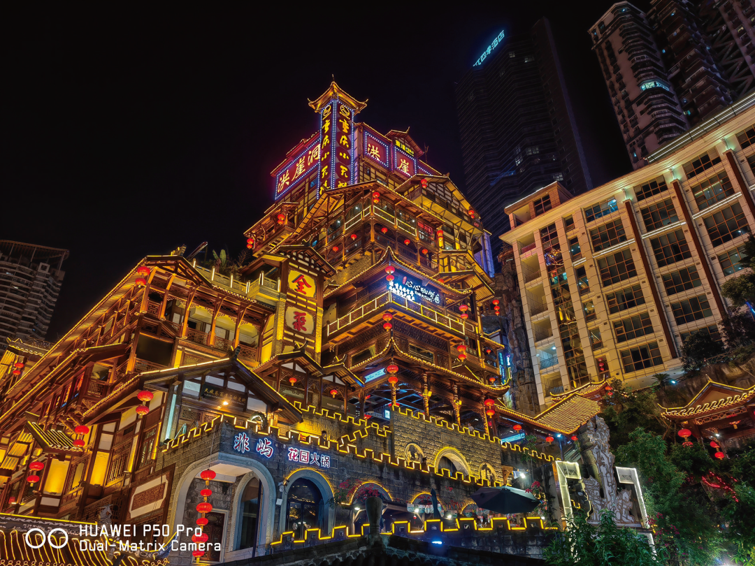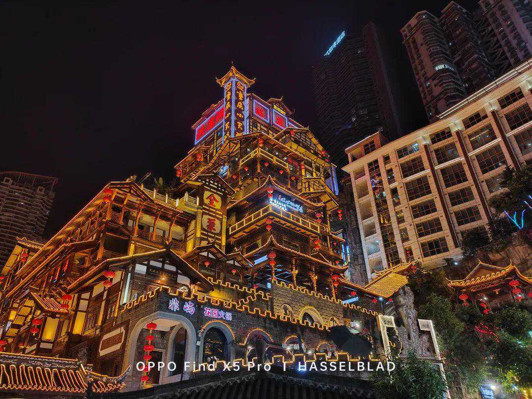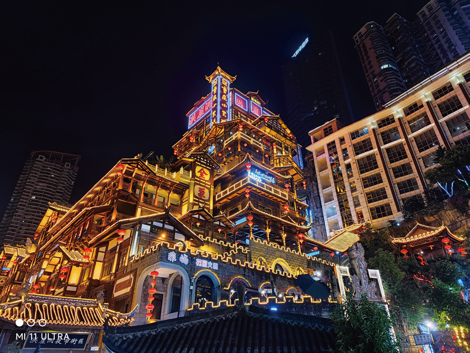 最后,终于到了夜景样张的对比环节,在这一年中,我们在太多发布会上听到了夜鹰、夜枭、夜X的算法,但到底它们的夜景表现如何呢,还是得实拍看一下。我们选择了重庆著名景点洪崖洞进行拍摄,这也是外地游客到重庆必来的景点之一。相较其他地方的夜景,复杂的木质建筑和多样的光线相当考验一款手机的拍照能力,接下来让我们看看这些手机在洪崖洞的考验下能够取得怎样的成绩吧。