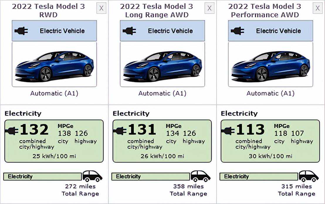 再看能效,根据美国EPA公布的数据,2022款Model3的最优综合能效可达132MPGe(折合百公里电耗15.9度),依旧是目前能效水平最好的BEV,而bZ4X在EPA测得的最优综合能效也仅为119MPGe(折合百公里电耗17.6度)。
