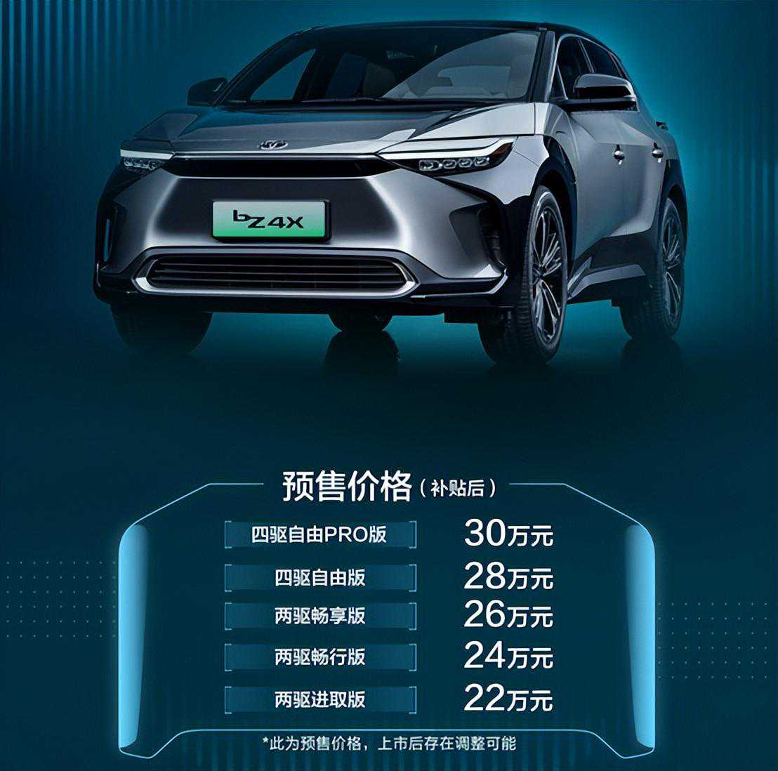 在bZ4X国内售价公布之前,不少人认为它至少要25万人民币起售,但丰田给了我们一个大惊喜,国内版本bZ4X的预售价仅为22-30万,不仅整体低于汉兰达(25.88-34.88万元),起售价还比RAV4的混动版本(22.58-25.98万元)要低。注意了,bZ4X目前公布的只是预售价,实际售价大概率会更低!