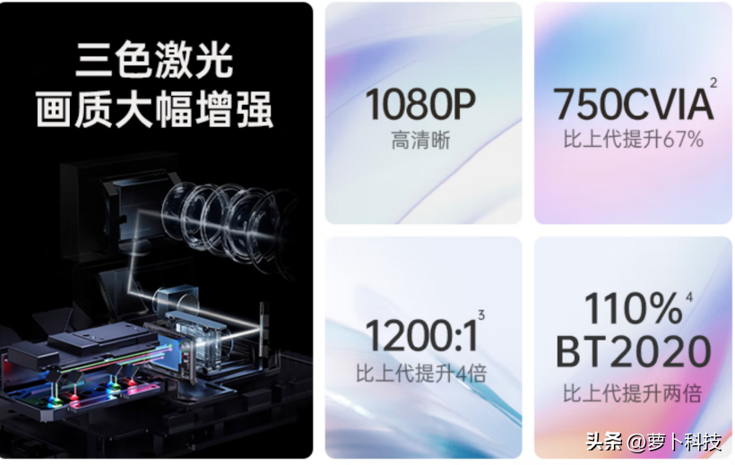 三色激光技术的原理是利用红、绿和蓝三个颜色的激光光源,通过激光产生、调制和合成的过程生成彩色图像并投影到屏幕上。因为激光光线本身具备高准直性、高纯净度、发光效率更高等特性,由此应用到投影仪上也就具备了以下优势: