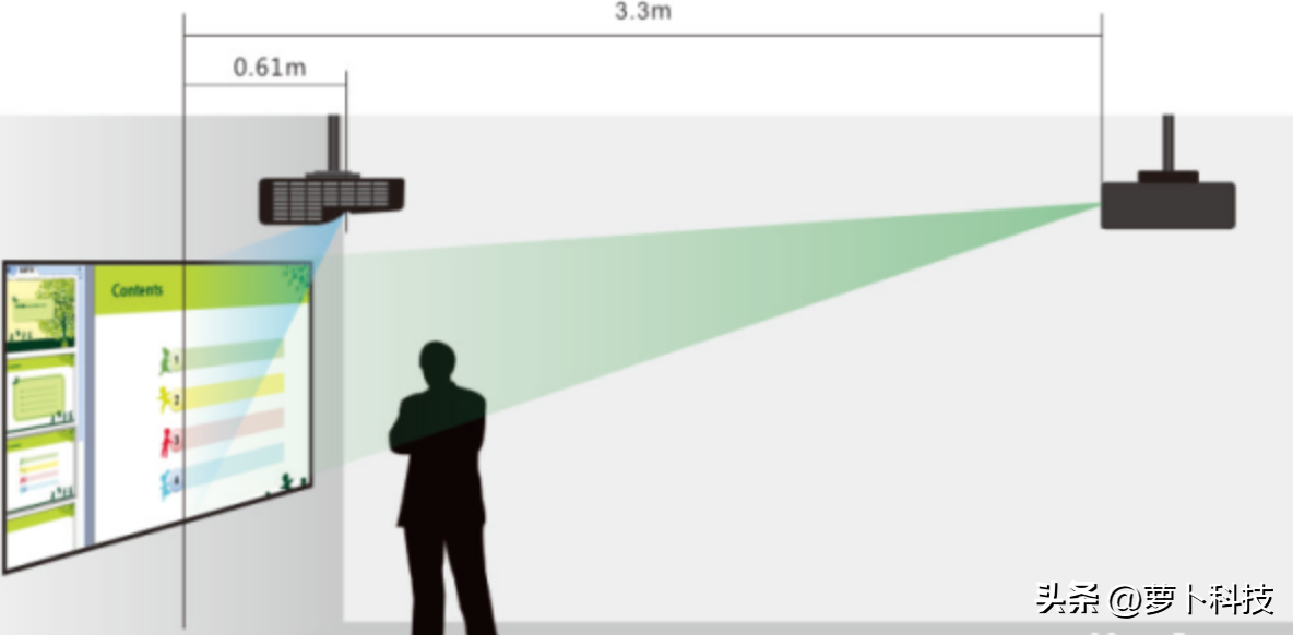 从直观角度看,长焦投影仪和超短焦投影仪很好区分,一个隔墙3米远投放,一个能贴墙投放。