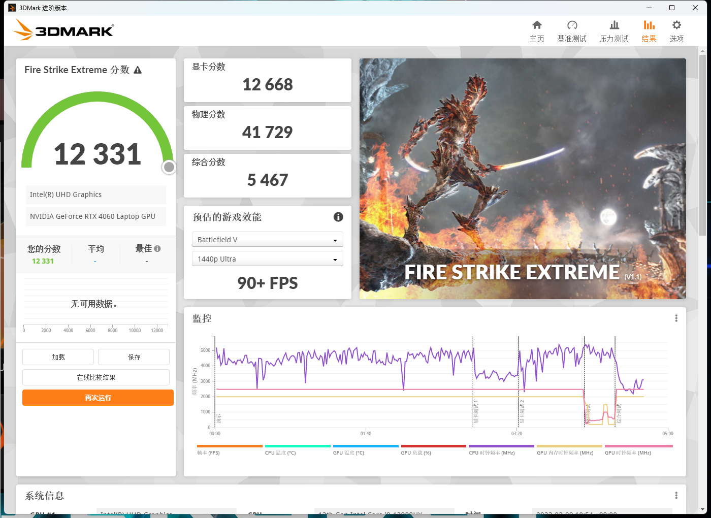 这一环节我们使用的是3DMark,在测评DX11性能的FireStrike测试中,RTX4060分别在Extreme和Ultra测试中取得了12668和5865分的图形分数;在测评DX12性能的TimeSpy测试中,RTX4080分别在基本测试和Extreme测试中取得了10406和5090分的图形分数,相比起上一代同定位的RTX3060要强上太多。