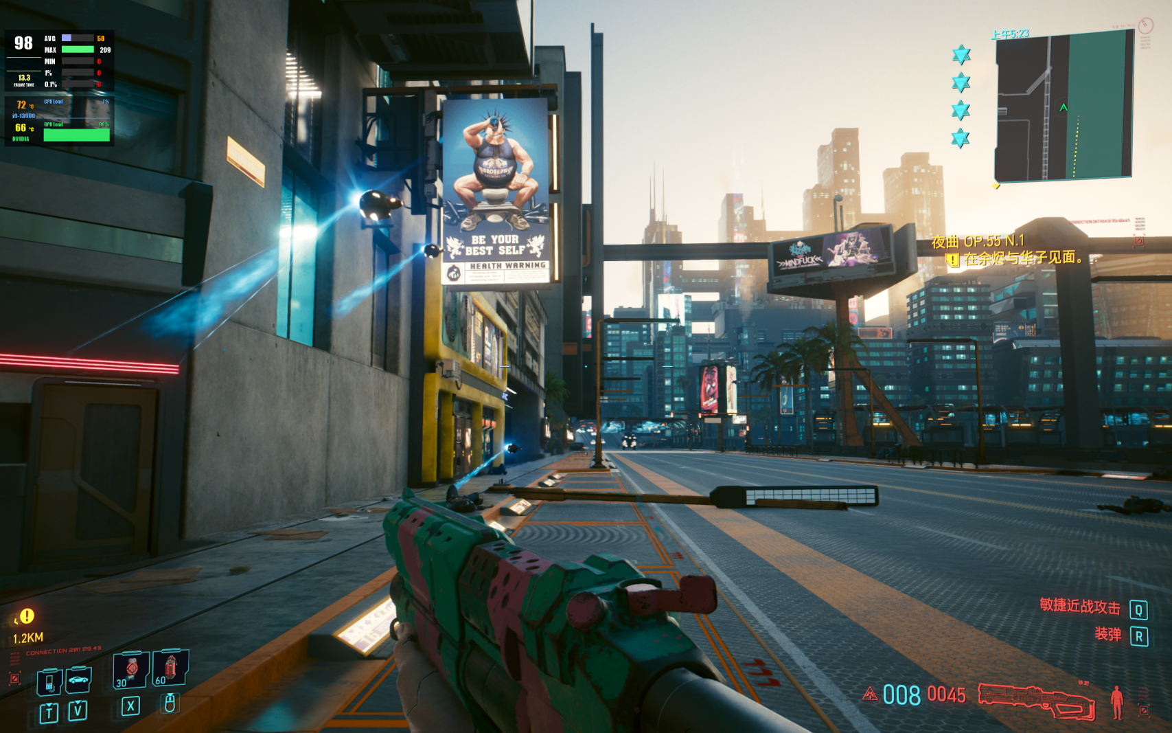 既然是RTX40系显卡的卖点之一,我们就必须针对这一点进行相关测试了,赛博朋克2077作为首批支持的游戏,自然而然也成为测试对象。实测在2560*1600分辨率最高画质、开启光线追踪功能的情况下,平均游戏帧率能够达到65fps,在此基础上我们再打开,能够发现帧数直接暴涨至98fps,而且几乎不会影响到游戏画质,游玩体验非常舒适。