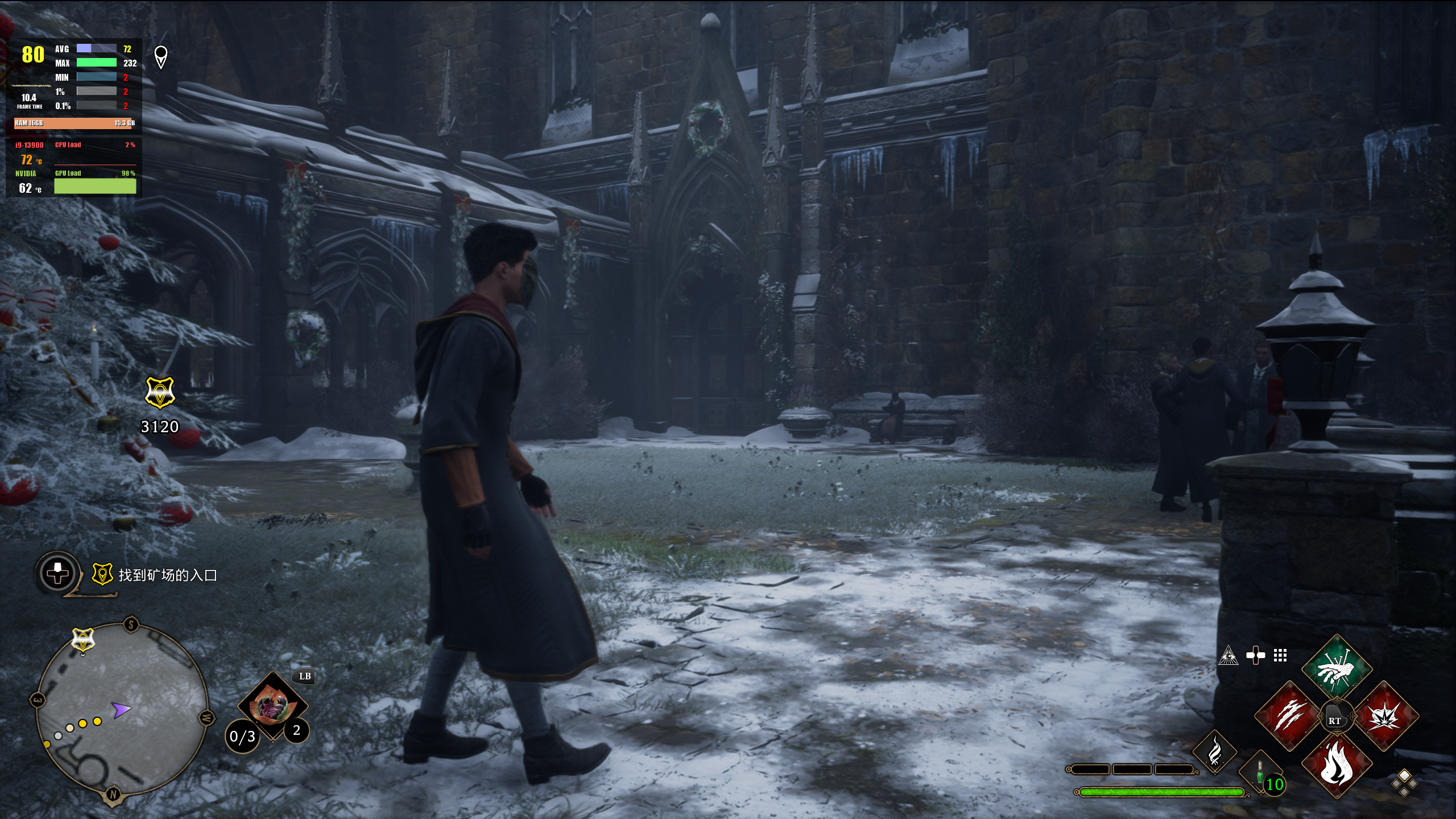 其次是近期非常火爆的《霍格沃茨之遗》,作为一款面向粉丝群体的游戏,它的优化相比起那些大厂要差上不少。实测在开启中等光追特效画质拉满的情况下,在大部分场景中都能跑到80帧上下,部分复杂场景和战斗环节会掉帧至60左右。