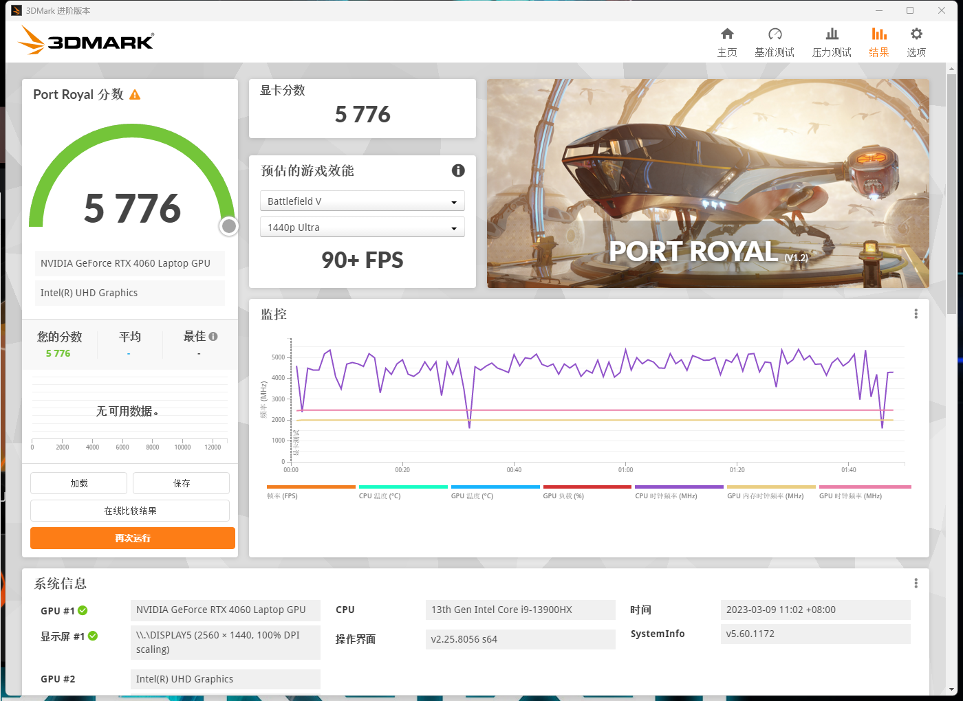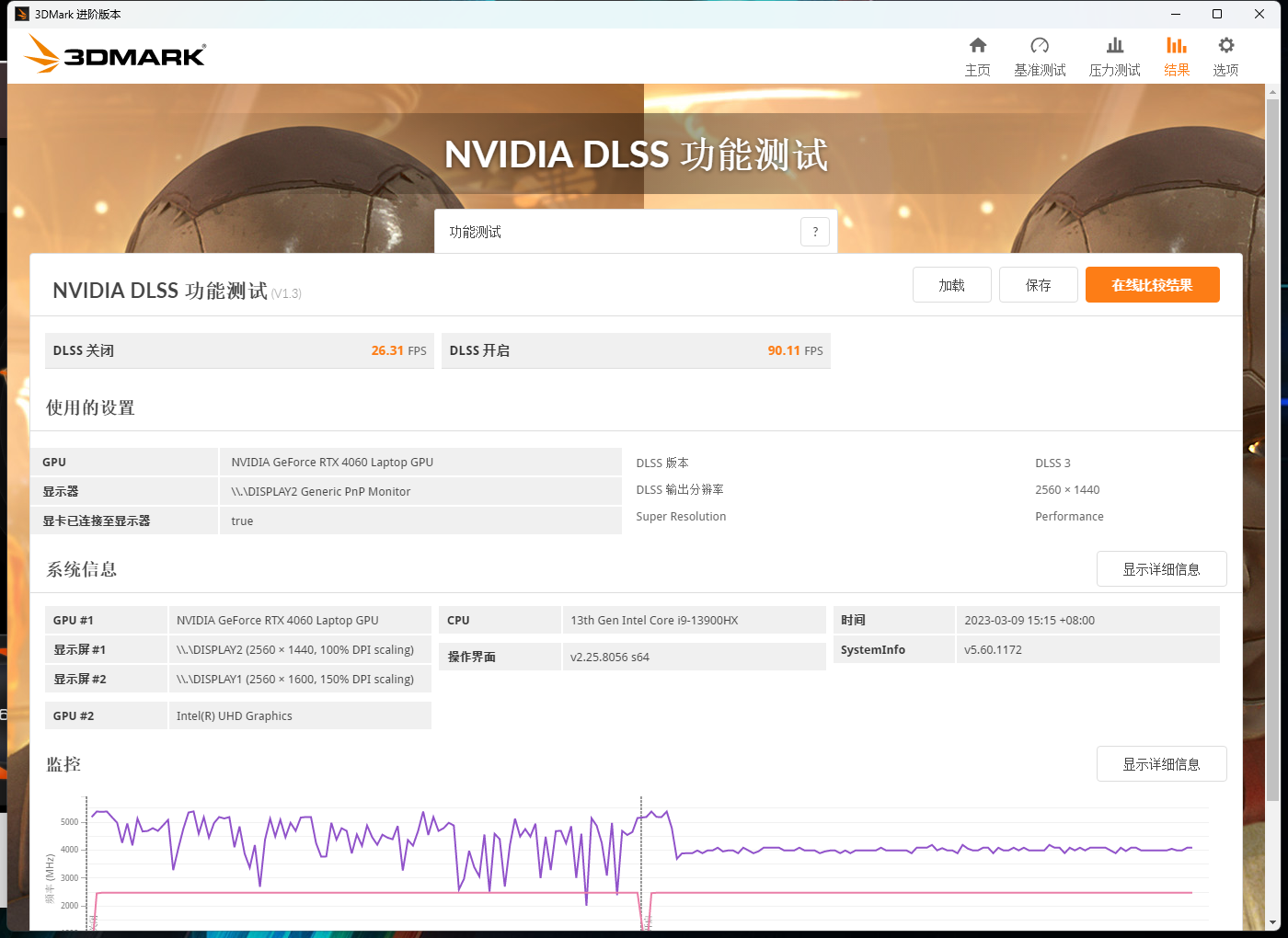 当然,我们都清楚40系显卡的技术和光追单元才是真正的王牌,如图所示,光追PortRoyal评分为5776分,这意味着我们使用移动端的RTX4060已经能够在开启光追功能的情况下运行大型3A动作游戏了。不过在DLSS测试中,由于默认选项是在4K分辨率情况下运行,所以平均帧率只能达到52.3帧,说明想让RTX4060在4K分辨率且开启光追的情况下稳定60帧是有一定难度的,不过更改成2K分辨率后,帧率就直接从26.31帧提升到了90.11帧。
