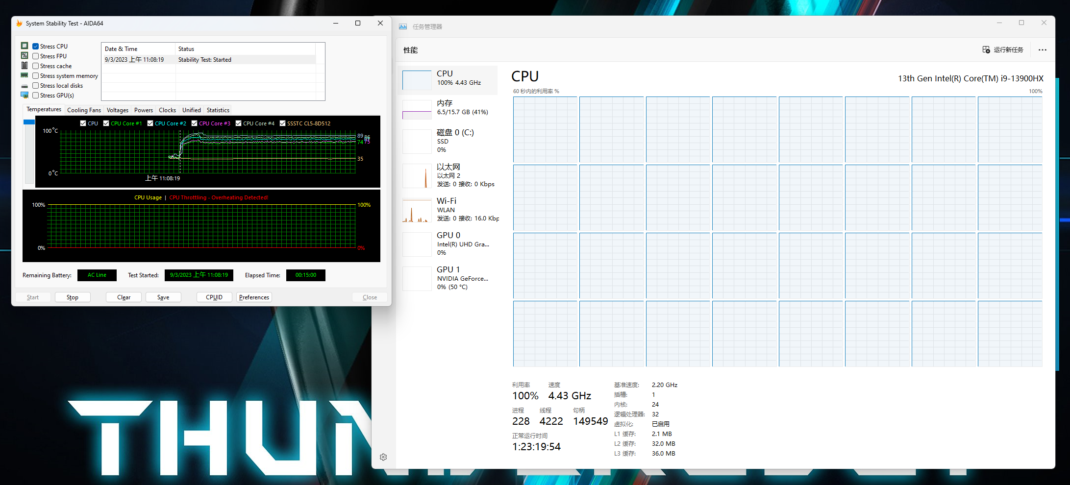 在这里也简单提一嘴雷神ZERO911的散热表现,毕竟这决定了性能释放的上限如何,如图所示在烤机15分钟后,CPU的频率依旧稳定在4.43GHz,核心温度控制在89℃上下,而在进行压力更大的双烤时,CPU频率稳定在2.4GHz左右,温度为72℃,GPU温度则是82℃,性能释放可以说直接拉满。
