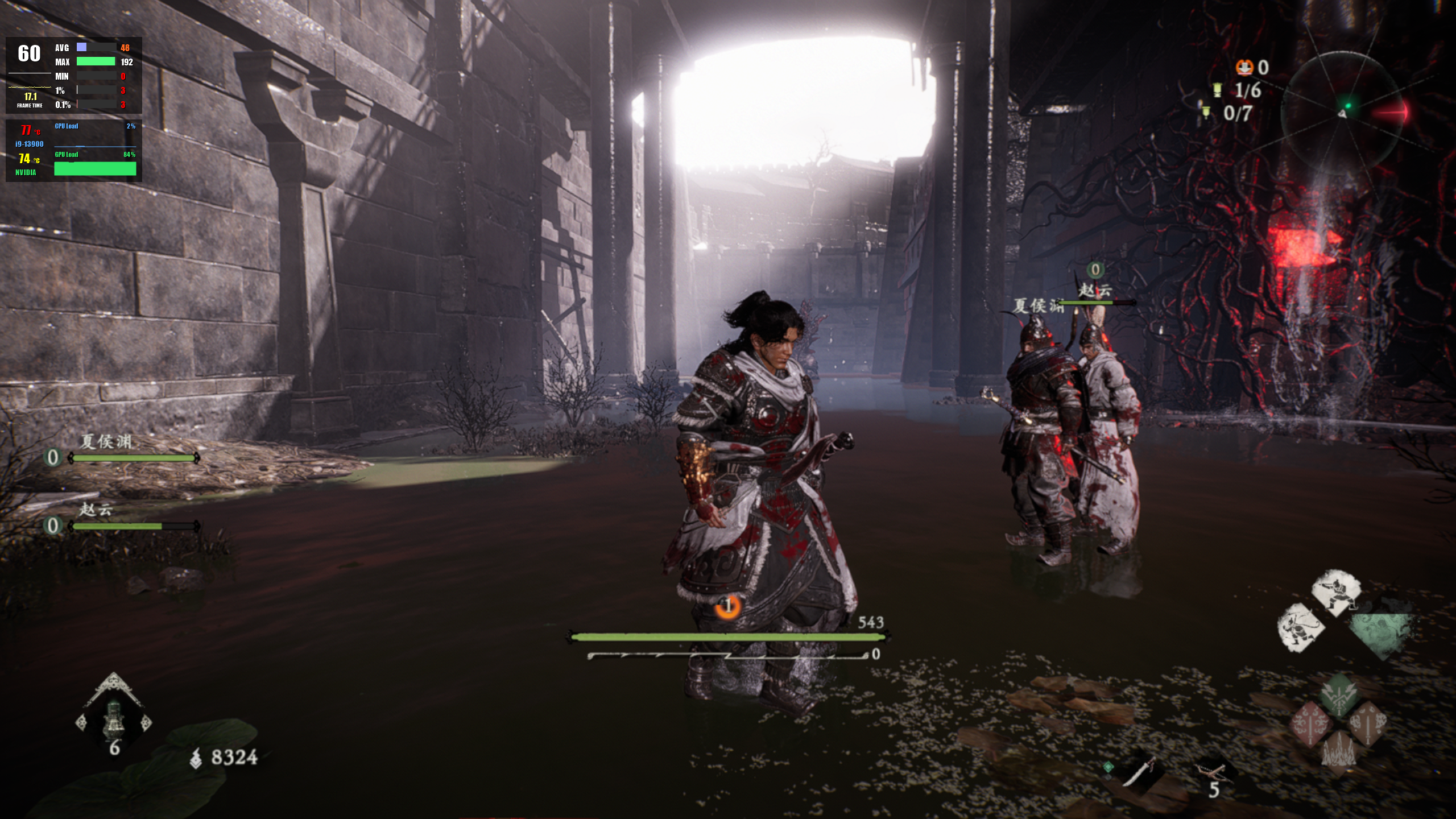 测试到这里,我们就该来点硬货了,要说近期优化最烂的游戏《卧龙苍天陨落》称第二,绝对没人敢称第一。同样在开启DLSS、默认2560*1600分辨率的情况下,在战斗环节中的平均帧率能够稳定在60帧不变,由于PC端的120帧目前是处于负优化状态,就不进行测试了,但对于这款类仁王游戏来说,能够稳定60帧就足够轻松游玩了。