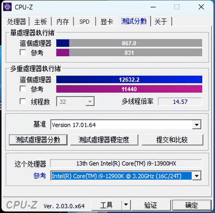 在CPU-Z环节中,雷神ZERO911所搭载的i9-13900HX单核得分为867,多核得分12632.2。从这份报告中我们能够看出其强大之处,甚至已经超越了上一代旗舰处理器i9-12900K,能够在移动端体验到如此“恐怖”的CPU,足矣说明十三代酷睿的实力之强悍。
