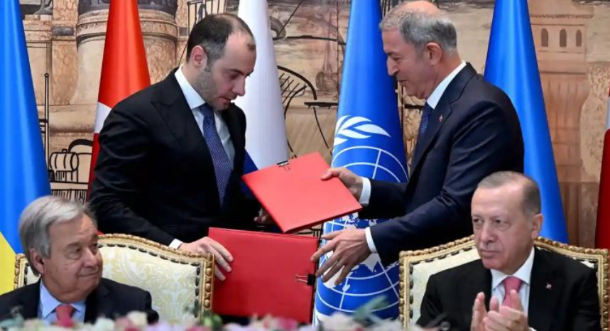 联合国秘书长安东尼奥·古特雷斯和土耳其总统雷杰普·塔伊普·埃尔多安出席了在伊斯坦布尔多尔马巴赫切宫举行的签字仪式,他们在数月的紧张谈判中发挥了关键作用。古特雷斯在仪式上发表讲话时表示,“希望的灯塔在黑海闪耀”,并呼吁俄罗斯和乌克兰全面落实该协议。