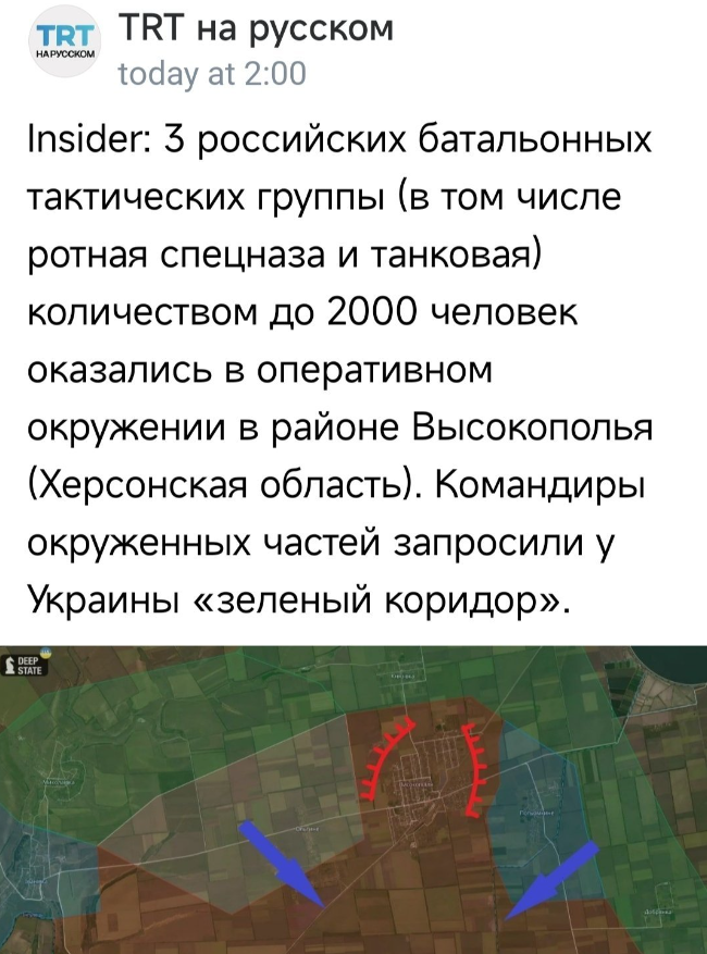据说2000名俄军在赫尔松地区被乌军包围,被包围部队俄指挥官向乌克兰请求“绿色走廊”。但我倾向于再观察一下此事不是真的。据乌克兰媒体介绍,包括一个特种部队连和一个坦克连在内的三个俄罗斯营战术组要求建立“绿色走廊”以脱离包围圈。