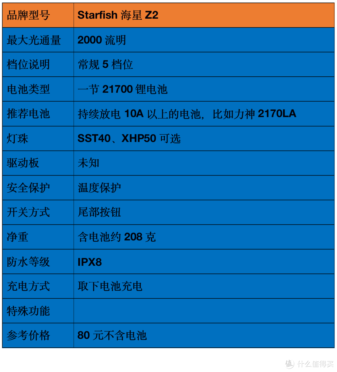 1.Starfish海星Z2,2000流明,80元首先要介绍的是中端里性价比超高的海星Z2,只要80元就可以买到2000流明的强光手电,当然这个价格是不含电池的,本文里介绍的价格都是不含电池的(内置电池的除外),我同时也建议大家单独购买电池,商家配套的电池一般都比较差,下一篇再为大家科普电池和充电器技术。海星是一个DIY强光手电品牌,DIY手电一般都是用公模手工制作,外观和工艺上看起来相对粗糙一些,主打高性价比,这款Z2就是高性价比里面的佼佼者: