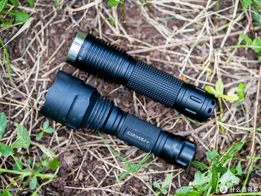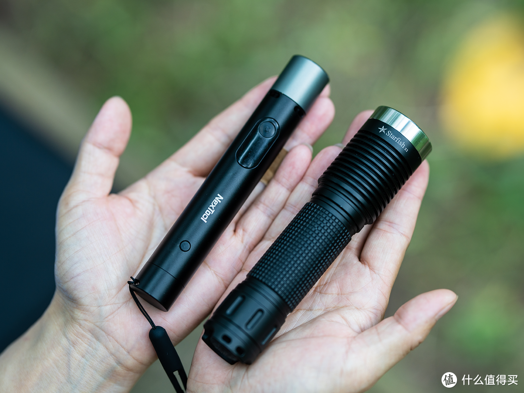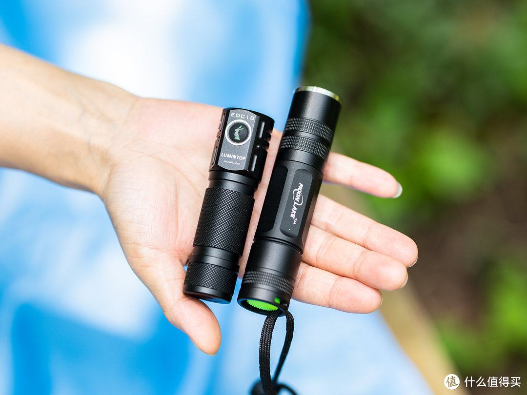 有的朋友可能会问500流明的强光手电有存在的意义吗?当然有,比如下面这两支手电,去骑行的话选哪支?我肯定选右边那支。亮度不高、功率不高的同时其实也意味着更安全,反正照亮路面、找东西是足够的,这样的手电即使被小孩拿去玩、在包里不小心误触也不会造成严重的事故,高流明的就不一定了。