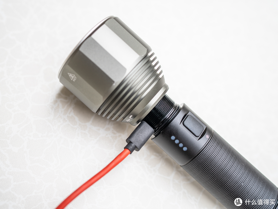 纳拓手电采用侧置开关设计,传统5档位式操作,开关旁边有4颗指示灯用来显示电量。由于采用26650电池的缘故,纳拓手电个头非常大,净重也达到了340克,整体长度甚至比我的傲雷掠夺者还要长,对于要求便携性的用户来说无疑是一个巨大的挑战。但大不一定只是缺点,筒身更大意味着有着更强的散热能力和续航能力,在某些场合大体型的手电更具威慑力,甚至可以临时充当防身工具。
