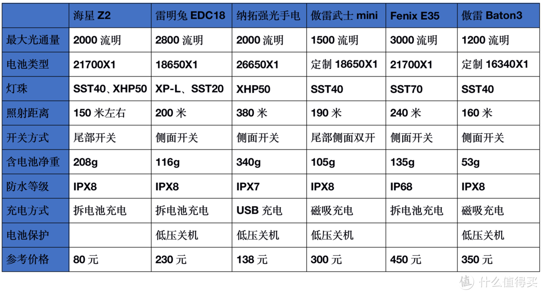 附以上6款中端1200-5000流明手电的综合参数表,方便对比: