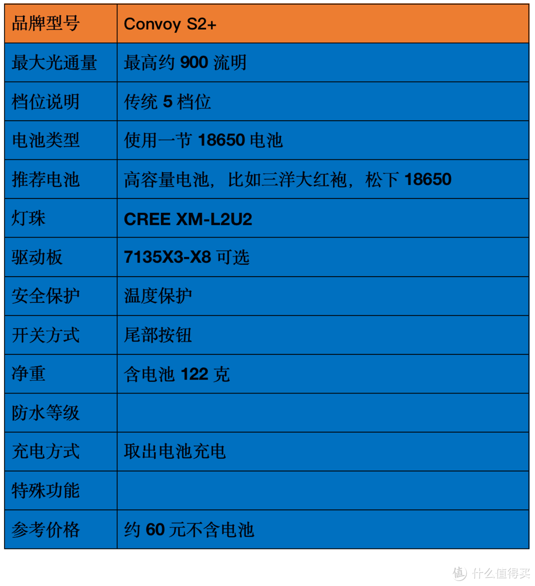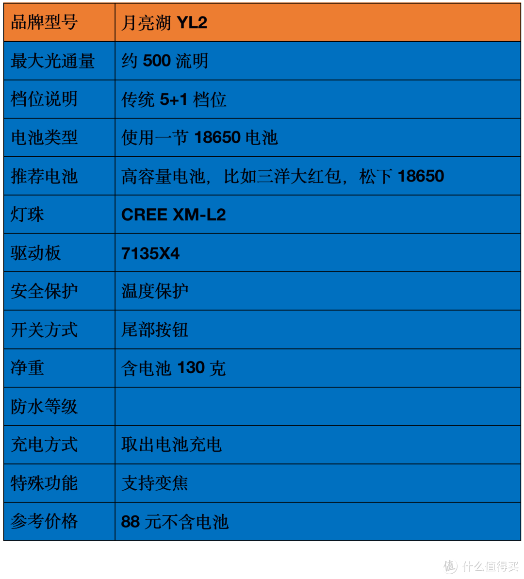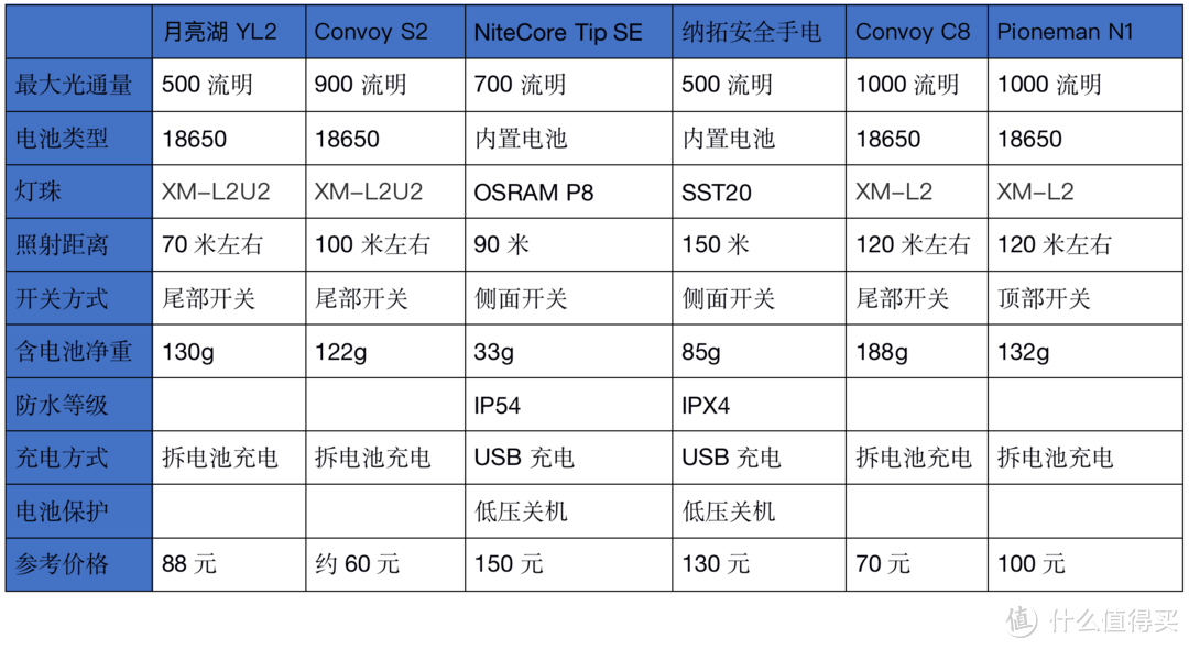 附以上6款入门1000流明以下手电的综合参数表,方便对比: