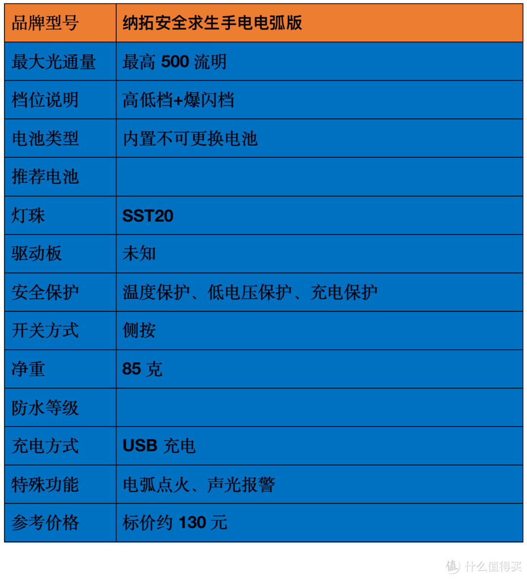 这个安全求生手电最高亮度500流明,用的灯珠是SST20,只有高低档两个档位和一个爆闪模式,最高亮度下续航时间2小时,可以看出来这款手电适合放在包里、车里应急使用:
