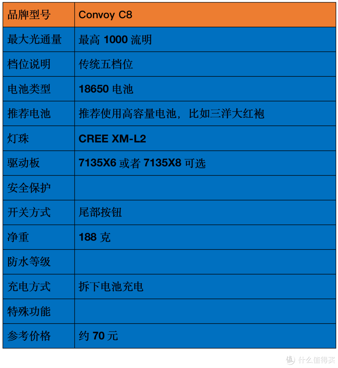ConvoyC8使用一颗CREEXM-L2灯珠,驱动有7135X6和X8可以选,X8最高电流2.8A,最高亮度约1000流明: