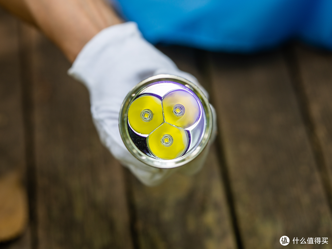 EDC18是三眼设计,采用3颗CREEXP-L或者SST20灯珠,最高亮度可以达到2800流明、10000坎德拉光强。透镜可以拆卸加装夜光片,夜光片需要额外购买,装上夜光片关闭手电后还会持续发光一阵子: