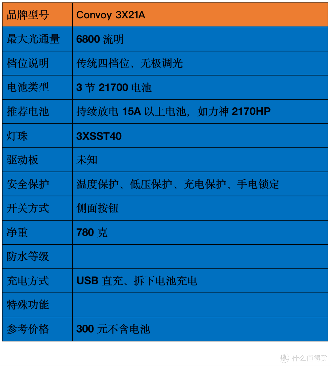 前面介绍的夜巡者NS73亮度达到了15000流明,但短板也非常明显,高亮档实用价值不高,一般人无法驾驭。那么有没有一款综合性能强一点的、价格又不高的呢?有,就是这款Convoy3X21A,体型大了一点没办法,鱼与熊掌不可兼得: