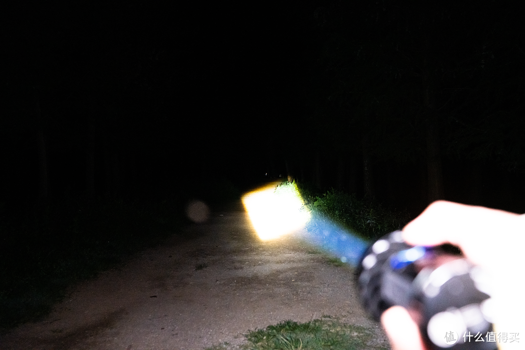 开到高亮档2000流明的效果,属于小泛光,铺路刚刚好;SST40灯珠中心都有比较明显的光斑,不过不会太刺眼,平时户外开中亮档1000流明其实也足够了。Z2有温度控制,当温度高于55度时会降低电流保证安全,实测Z2的温度控制相对要好一些,开启高亮档后10秒左右才有明显的温升,其他同档位手电有的都已经非常烫了。使用照度计实测最高亮度下持续4分钟后开始持续降低亮度。至于续航,和选用的电池容量有关,不过这种单节的21700强光手电续航能力都不怎么样,开中高档也就一两小时使用时间,长时间是用的话最好是多带一两节电池在身上。