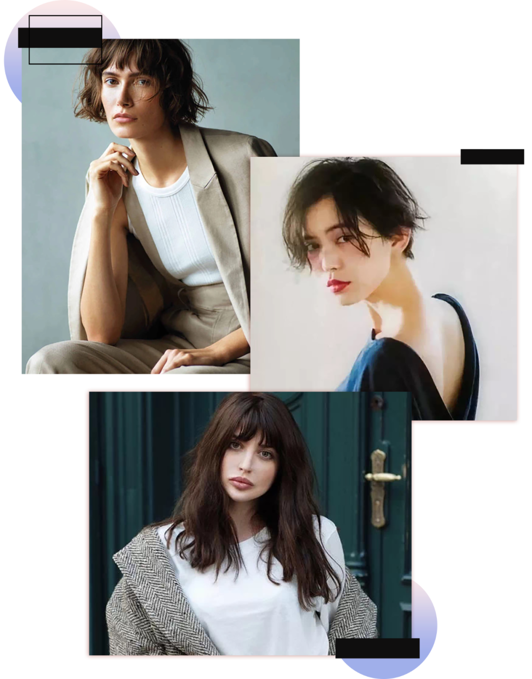 具体到发型上,避免直短发或者单一的内扣,尽量让那个头发多一些凌乱感、起伏度。