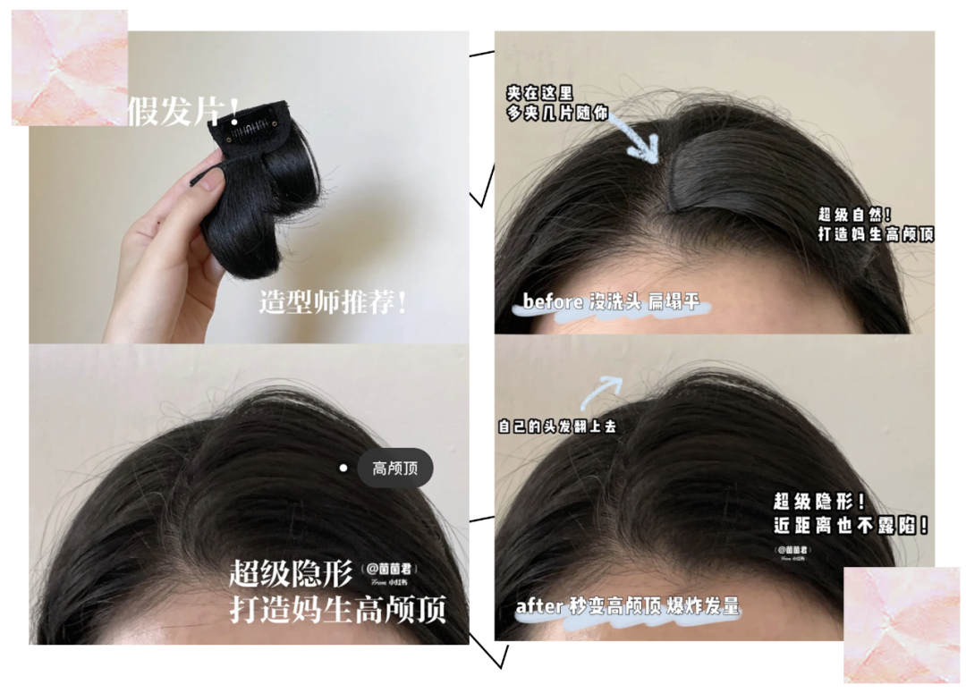 毕竟现在的假发设计真的太方便了,大家可以购买分股一小把的那种,直接像发卡一样扣在原本的内层头发上就OK~(千万别直接扣在头发表面上)