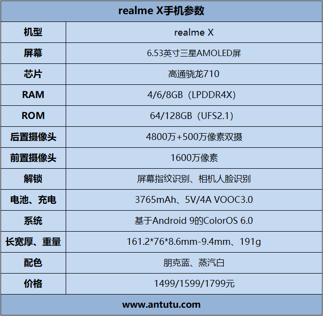 我们拿到的是售价1499元起的realmeX,该机使用升降式前摄方案,将前摄隐藏在升降结构内,正面采用6.53英寸三星AMOLED屏,搭载高通骁龙710芯片,提供4/6/8GBRAM+64/128GBROM,电池容量为3765mAh,支持VOOC闪充3.0。