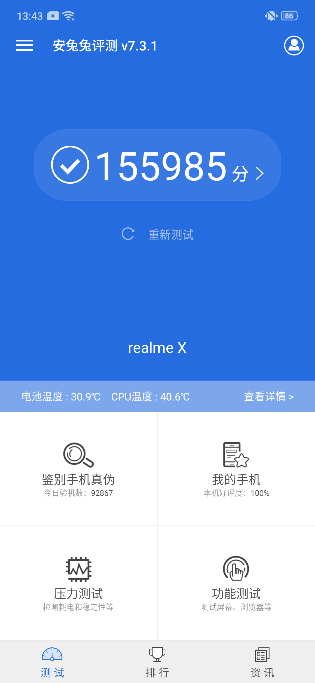 realmeX的安兔兔跑分为155985,符合骁龙710的正常表现。