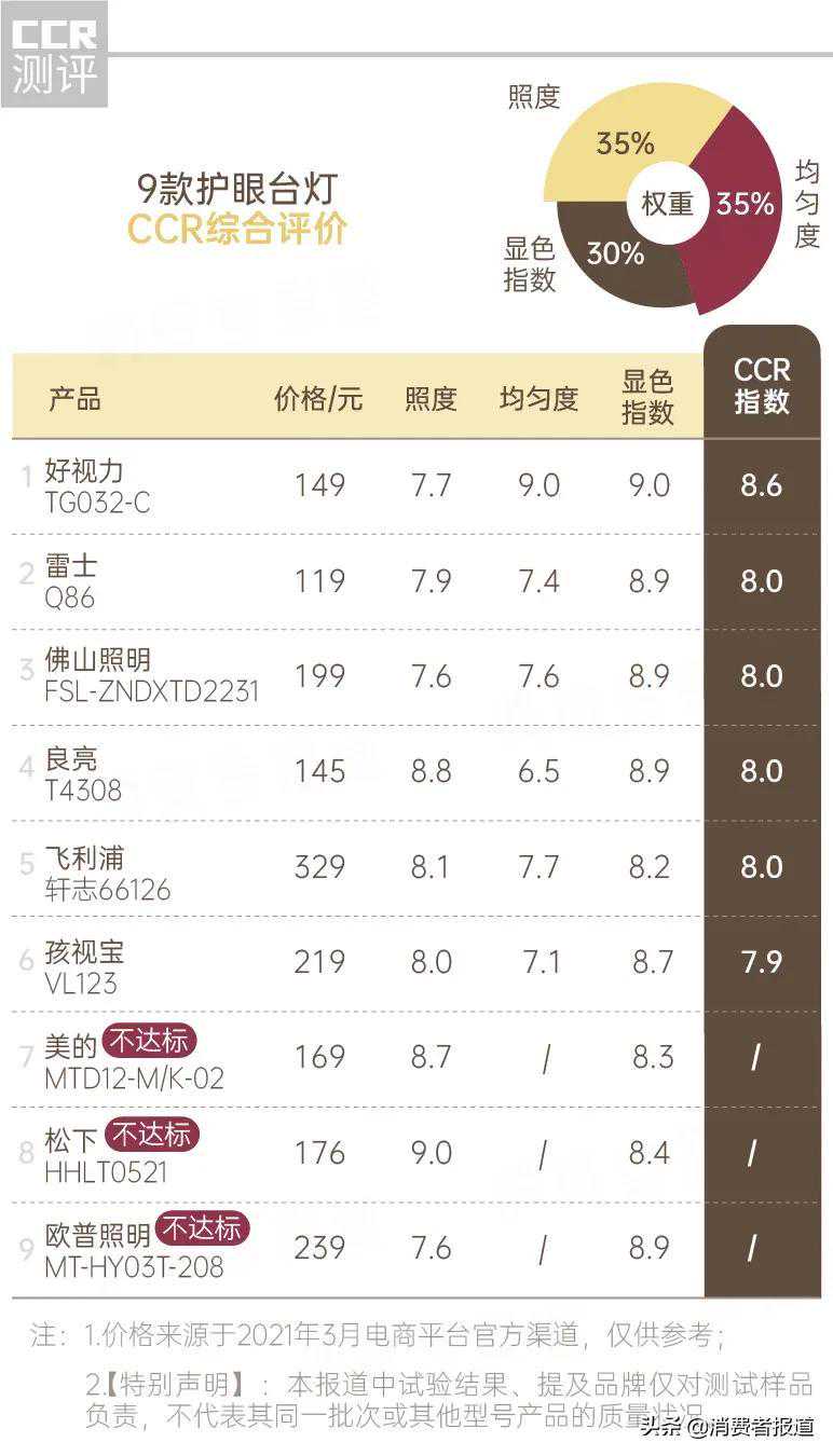 综合照度、均匀度、显色指数3项指标,得出9款台灯的综合评分。