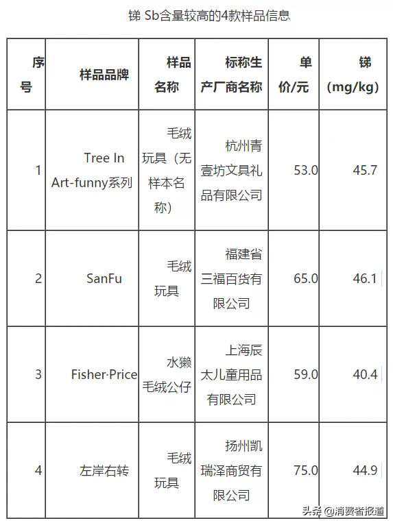 经测试,48款毛绒玩具特定元素的迁移均符合标准要求,其中砷As、钡Ba、镉Cd、铬Cr、铅Pb、汞Hg、硒Se均未检出,22款样品可迁移元素锑Sb有检出,4款样品检出值>40mg/kg(见下表),但在标准要求检出量≤60mg/kg的范围内,消费者可谨慎选择购买。