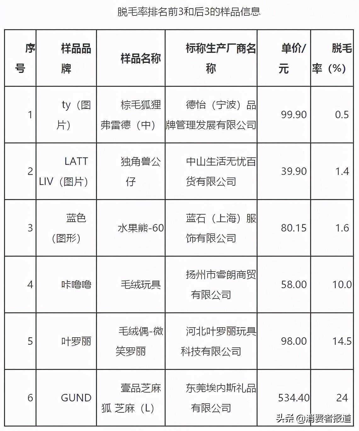 毛绒玩具均有脱毛情况出现,不同的毛绒玩具脱毛率存在较大差异,脱毛率最低为0.5%、最高24.0%。
