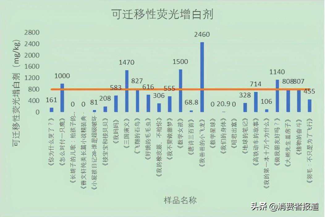 测试结果显示,4款儿童读物未检出可迁移性荧光增白剂,21款儿童读物检出可迁移性荧光增白剂,其中8款儿童读物的可迁移性荧光增白剂检出值超过标准要求的800mg/kg,不符合标准要求。