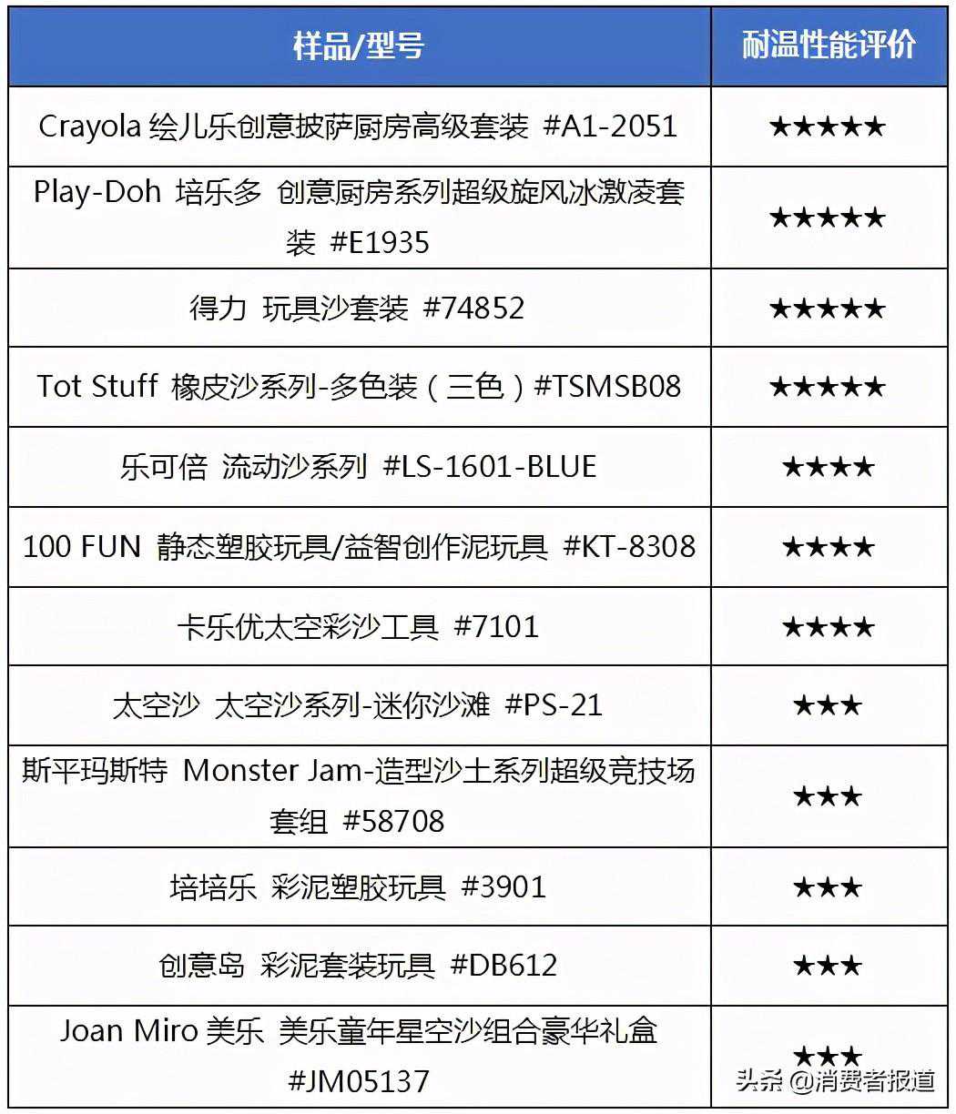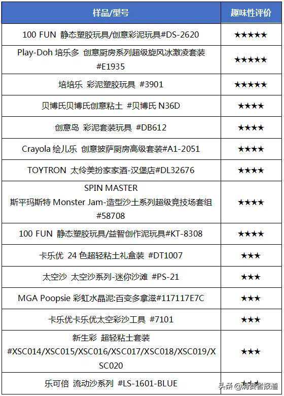 趣味性评价结果显示,传统橡皮泥、超轻粘土、太空沙总体比水晶泥好,有大型模印工具的样品更具趣味性,如雪糕机、糖果机。将通过安全性能指标的28款样品的趣味性表现进行星级排名,表现较好的评价3星及以上的产品如下表。