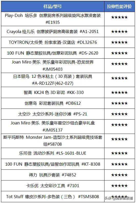 可塑性/拉伸性测试结果显示,传统橡皮泥和超轻粘土的造型能力表现出色,而太空沙由于材质松软特性,造型能力比传统橡皮泥和超轻粘土要差。水晶泥的拉伸性能也普遍较好,最长的可拉伸至3.1米。将通过安全性能指标的传统橡皮泥、超轻粘土和太空沙样品的造型能力表现进行星级排名,表现较好的评价3星及以上产品见下表,而水晶泥只有三款通过安全性能指标,不进行星级排名。