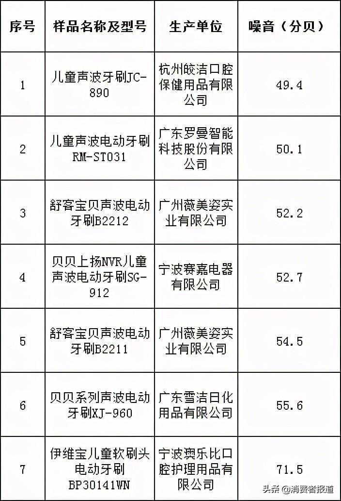 本次比较试验的7款样品中噪音最小的是杭州皎洁口腔保健用品有限公司生产的儿童声波牙刷,噪声为49.4分贝;噪音最大的是宁波澳乐比口腔护理用品有限公司生产的伊维宝儿童软刷头电动牙刷,噪声达71.5分贝,使用该款儿童电动牙刷就相当于小朋友在闹市区的马路上刷牙。