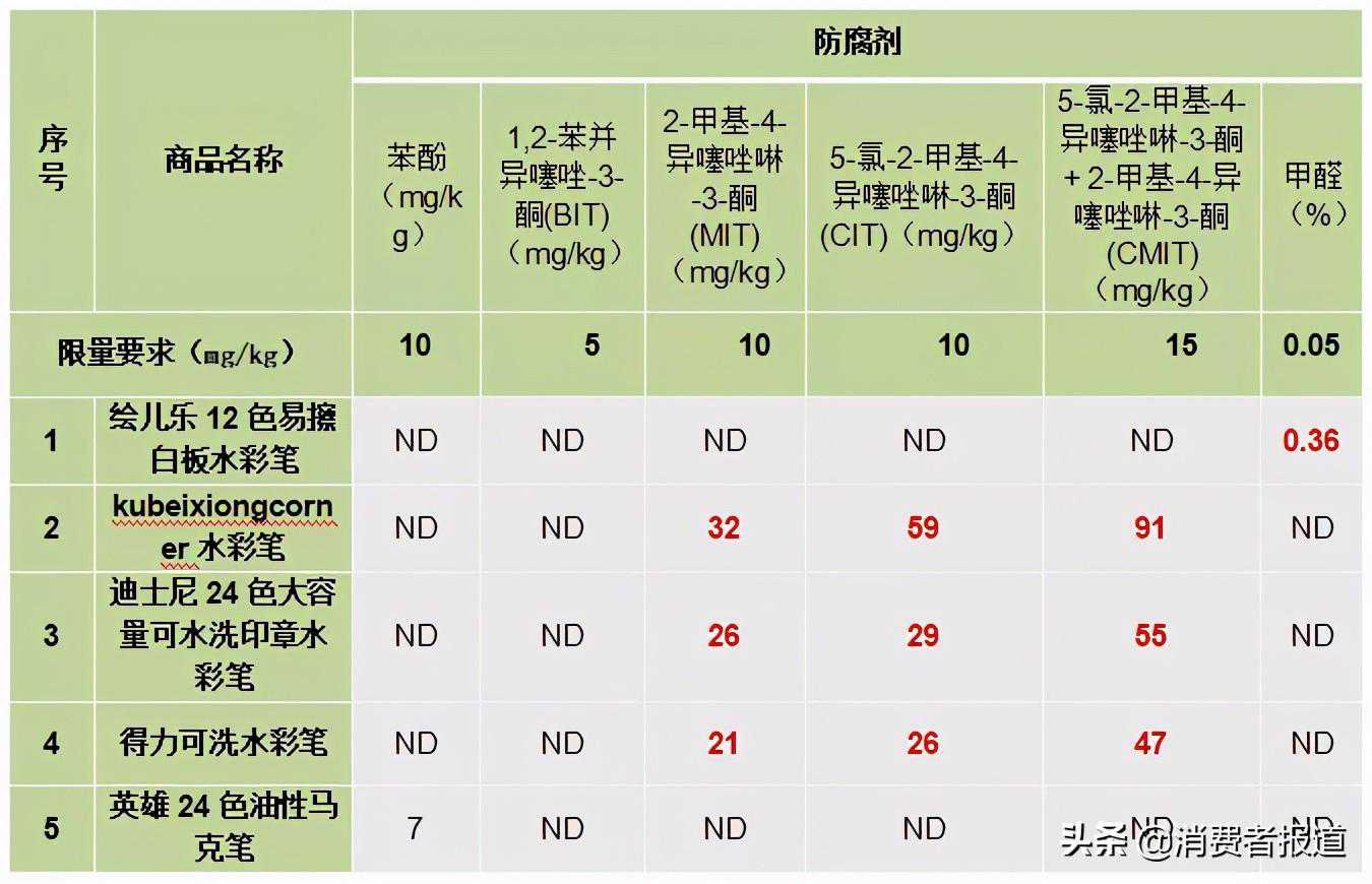 检测结果显示,绘儿乐、kubeixiongcorner、迪士尼、得力、英雄共5款样品检出防腐剂,其中英雄牌马克笔有检出,但符合相关标准要求,绘儿乐、kubeixiongcorner、迪士尼、得力4款水彩笔样品的防腐剂(甲醛、异噻唑啉酮类)则超出欧盟标准限量要求。