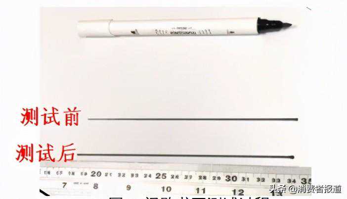 另外,对25款样品的间歇书写进行测试的结果显示,13款水彩笔取下笔帽放置5小时后,仍能出墨正常;12款马克笔取下笔帽放置30分钟,仍能出墨正常。