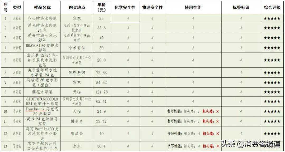 25款水彩笔、马克笔对比2020年9月,江西省消费者权益保护委员会联合深圳市消费者委员会、福田区消费者委员会、宝安区消费者委员会公布了对25款市售水彩笔、马克笔的比较试验结果。