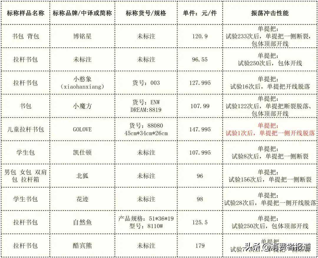 有7个批次明示执行标准为QB/T1333-2010《背提包》,标称品牌为“博铭星、小憨象、小魔方、凯仕顿、北狐、花迹、酷宾熊”的样品振荡冲击性能(单提把)在试验中均有不同程度的损坏;